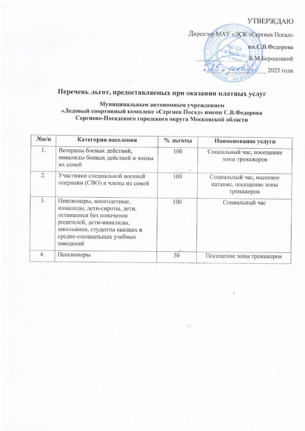 В Муниципальном автономном учреждении "Ледовый спортивный комплекс "Сергиев Посад" имени С.В.Фёдорова согласно действующему перечню платных услуг, утвержденному 1 января 2026 года, действует соответствующий перечень установленных льгот, в том числе для участников специальной военной операции и членов их семей.
