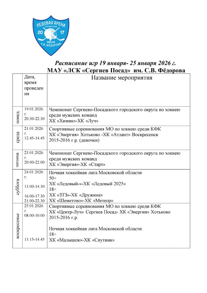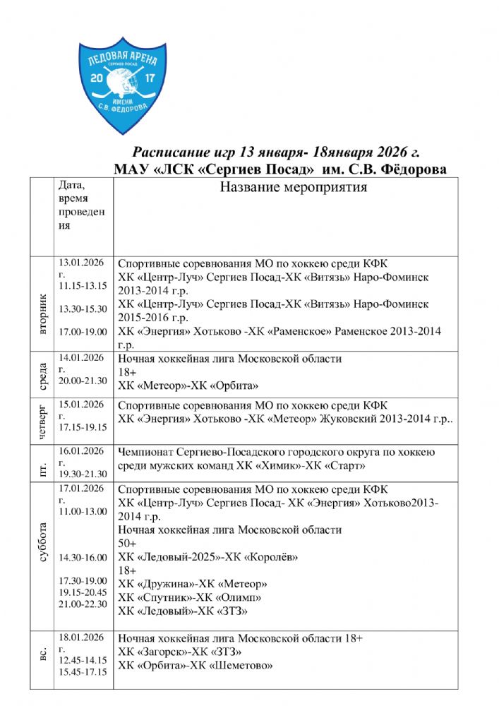 расписание игр 13 января-18 января 2026 г.
