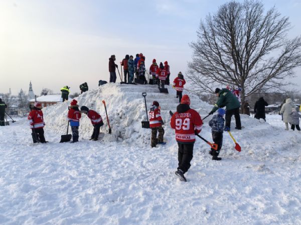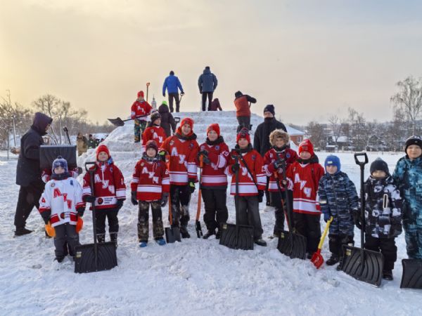 Масштабное строительство привлекло множество участников. В создании горки приняли участие: сотрудники служб благоустройства Сергиево-Посадского городского округа, работники нашего ледового комплекса, тренеры и воспитанники отделения хоккей спортивной школы «Центр», местные жители и многие другие.